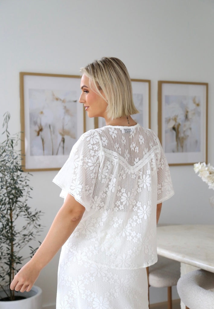 Elevate your everyday style with this stunning white lace shell blouse that's equal parts elegant and effortless. The delicate see-through lace yoke creates a gorgeous silhouette, while the lined bodice keeps things modest and comfortable. Adorned with dainty buttons down the front, this versatile piece pairs beautifully with the matching skirt for a coordinated look or dress it down with your favourite denim jeans. Perfect for those moments when you want to feel a little extra fabulous.